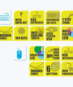 Zeb-War is a wired gaming keyboard and mouse combo that comes with 104 keys, multi-color LED’s with 4 modes, 3 brightness level modes along with a braided cable and gold plated USB. The mouse comes in an ergonomic design with breathing LED lights. The USB mouse has 6 buttons and is a high precision one with 3200 DPI that comes with a braided cable.